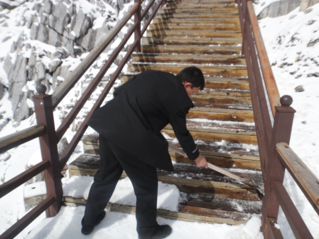 The mist begins to clear and the Chinese gasp and cheer as the peaks and surrounding scenery become visible. There are wooden steps going higher from the cable car station and we join the parade of Chinese to reach the top point. A workman in a uniform with a shovel attempts to clear the ice from the steps. We have to walk slowly because of the altitude and carefully because of the slipperiness of the steps.