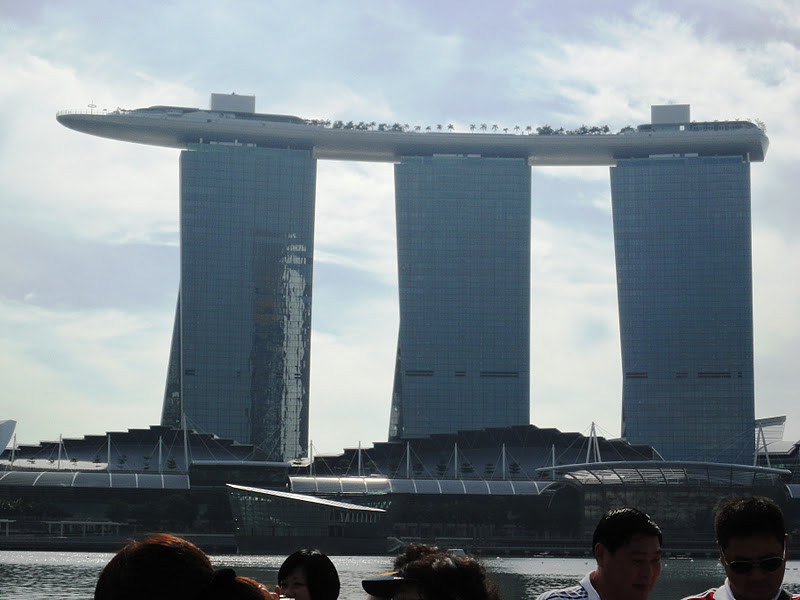 This crazy building is the latest hotel to be built. It is on reclaimed land and appears to have a huge ship across the top of the 3 towers of the hotel.